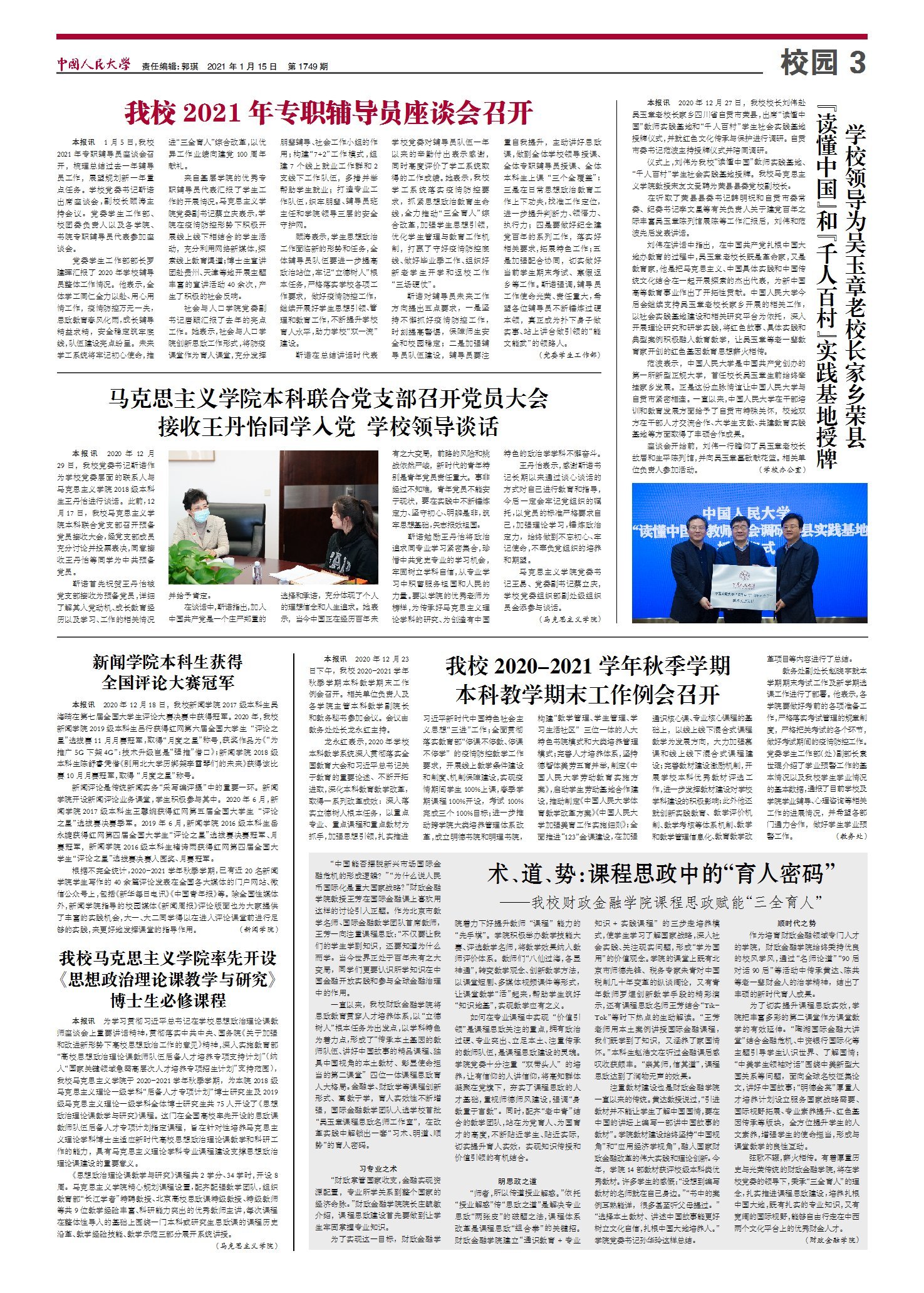如何在专业课程中实现“价值引领”是课程思政关注的重点,拥有政治过硬、专业突出、立足本土、注重传承的教师队伍,是课程思政建设的灵魂。学院党委十分注重“双带头人”的培养,让有信仰的人讲信仰,将高知群体凝聚在党旗下,夯实了课程思政的人才基础,重视师德师风建设,强调“身教重于言教”。同时,配齐“老中青”结合的教学团队,站在为党育人、为国育才的高度,不断贴近学生、贴近实际,切实提升育人实效,实现知识传授和价值引领的有机结合。明思政之道“师者,所以传道授业解惑。”依托“授业解惑”传“思政之道”是解决专业思政“两张皮”的破题之法,课程体系改革是课程思政“组合拳”的关键招。财政金融学院建立“通识教育+专业知识+实践课程”的三步走培养模式,使学生学习了解国家战略,深入社会实践、关注现实问题,形成“学为国用”的价值观念。学院的课堂上既有北京市师德先锋、税务专家朱青对中国税制几十年变革的纵谈阔论,又有青年教师罗煜创新教学手段的精彩演示,还有课程思政名师王芳结合“Tik-Tok”等时下热点的生动解读。“王芳老师用本土案例讲授国际金融课程,我们既学到了知识,又涵养了家国情怀。”本科生赵浩文在听过金融课后感叹收获颇丰。“亲其师,信其道”,课程思政达到了润物无声的效果。